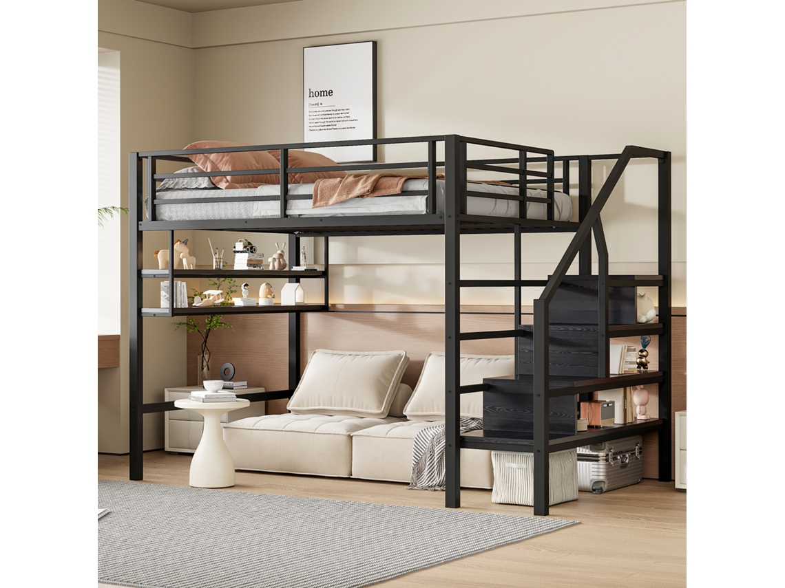 Cama Alta Multifuncional Prateleiras Escada Armazenamento Espaço Livre Pangshiyaun Metal Preto (160x225x145cm)