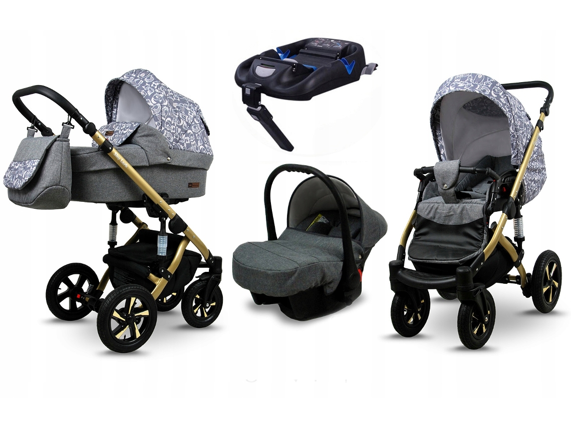 Carrinho de Bebé Multifuncional BABYLUX SKY LARK 4 Em 1 -Grey Animals GOLD FRAME - Ajustável e dobrável Construção leve em alumínio - Acessórios