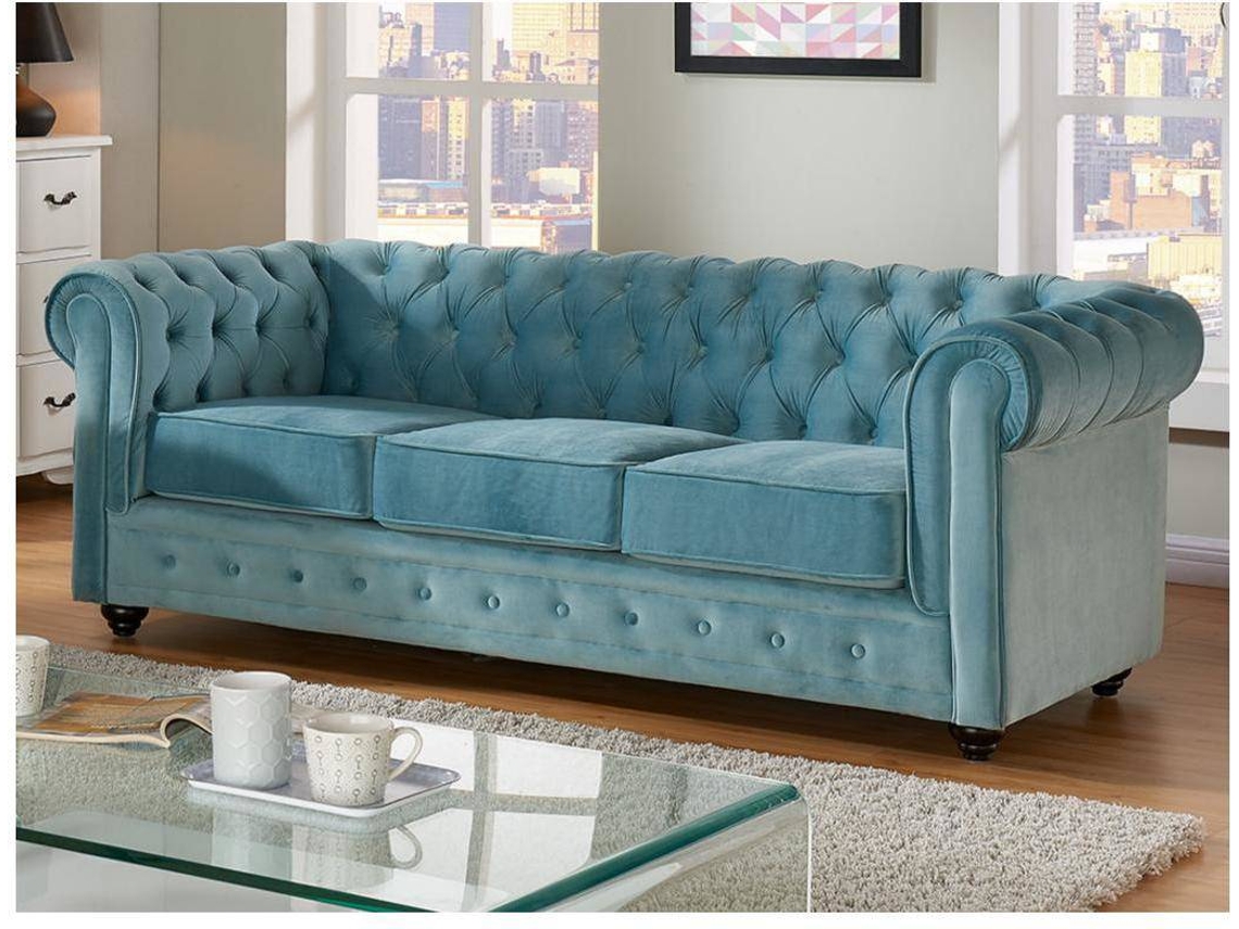 Sofá Fixo Chesterfield VENTE-UNIQUE (Azul Claro - Tecido e Veludo - 205x88x72 cm)