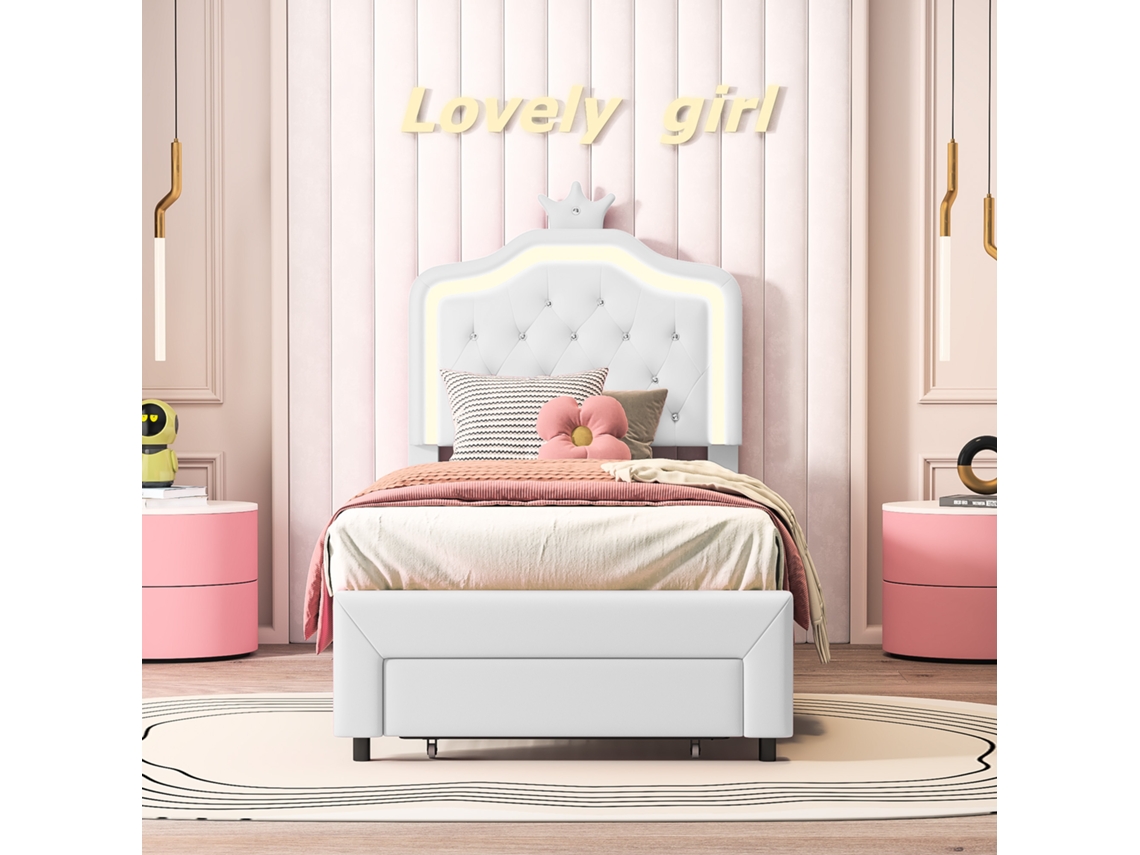 Cama De Princesa Branca Com Coroa E Luz Led, 90x200cm, Cama De Criança Com Gaveta De Armazenamento E Estrutura Em Pu