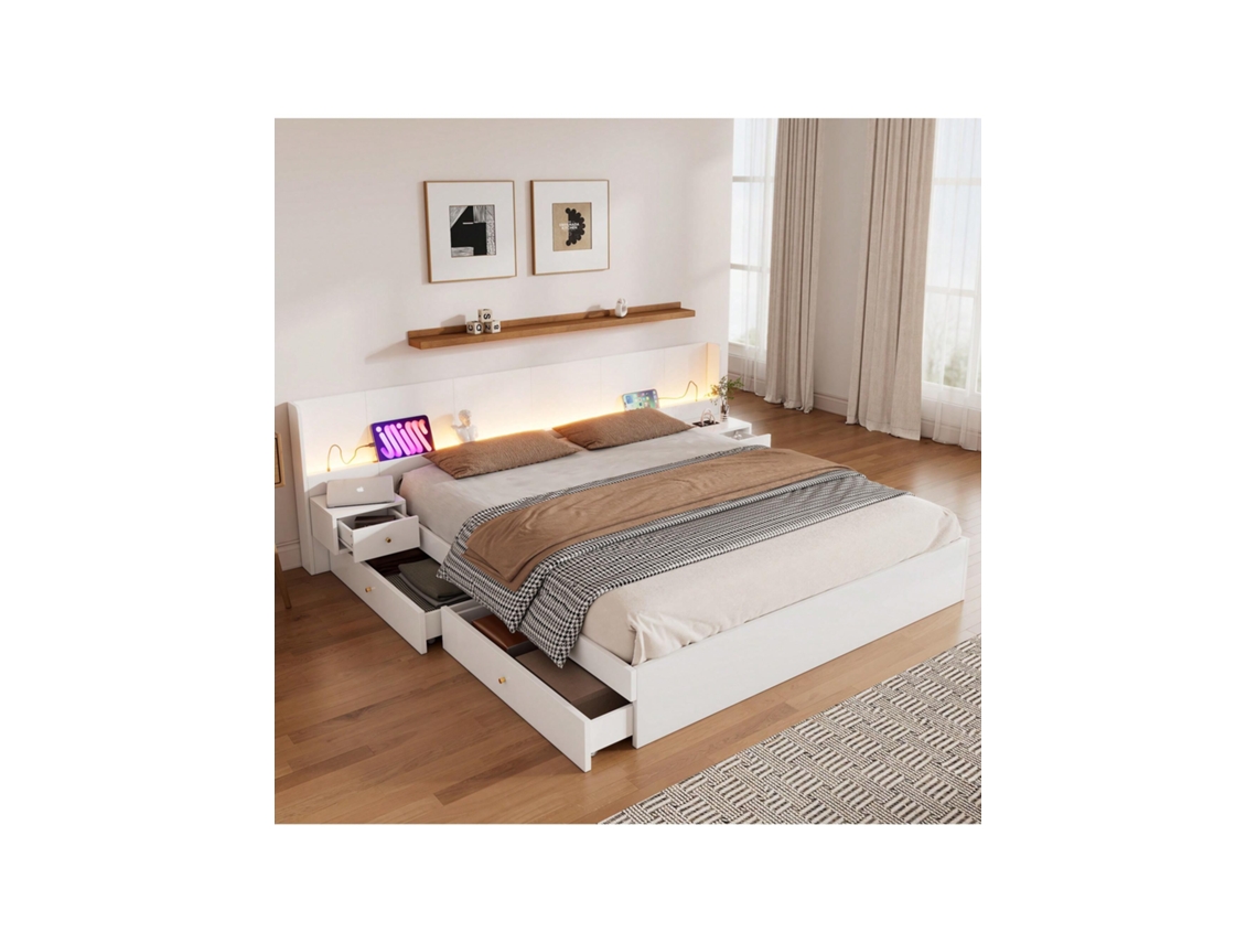 Cama Casal 180x200cm Em Madeira Com Usb, Led E Tomadas, Controlo Por App, 2 Mesas De Cabeceira Com Gavetas, Branco Sem Colchão Liptaptyn