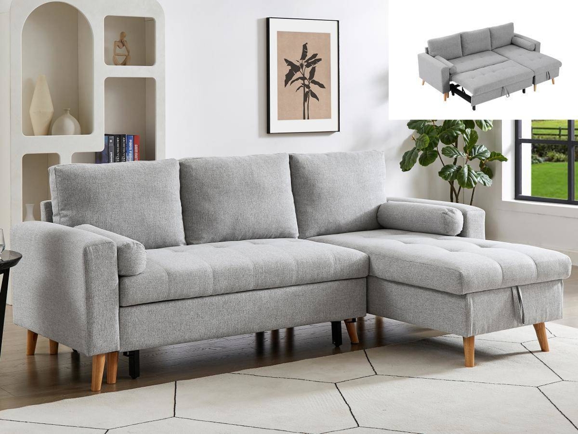 Sofá Cama Kori VENTE-UNIQUE (Cinzento Claro - Tecido e Veludo - 225x146x88 cm/Dimensões da cama: 100-119 cm)